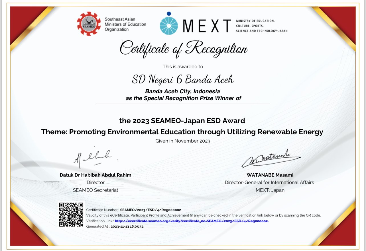 ![]() | Certificate of Recognition The 2023 SEAMEO-Japan ESD Award Theme : Promoting Environmental Education through utilizing renewable energy |