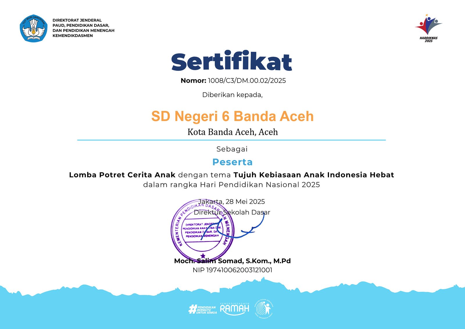 ![]() | Sertifikat Peserta Lomba Potret Cerita Anak Tujuh Kebiasaan Anak Indonesia Hebat |