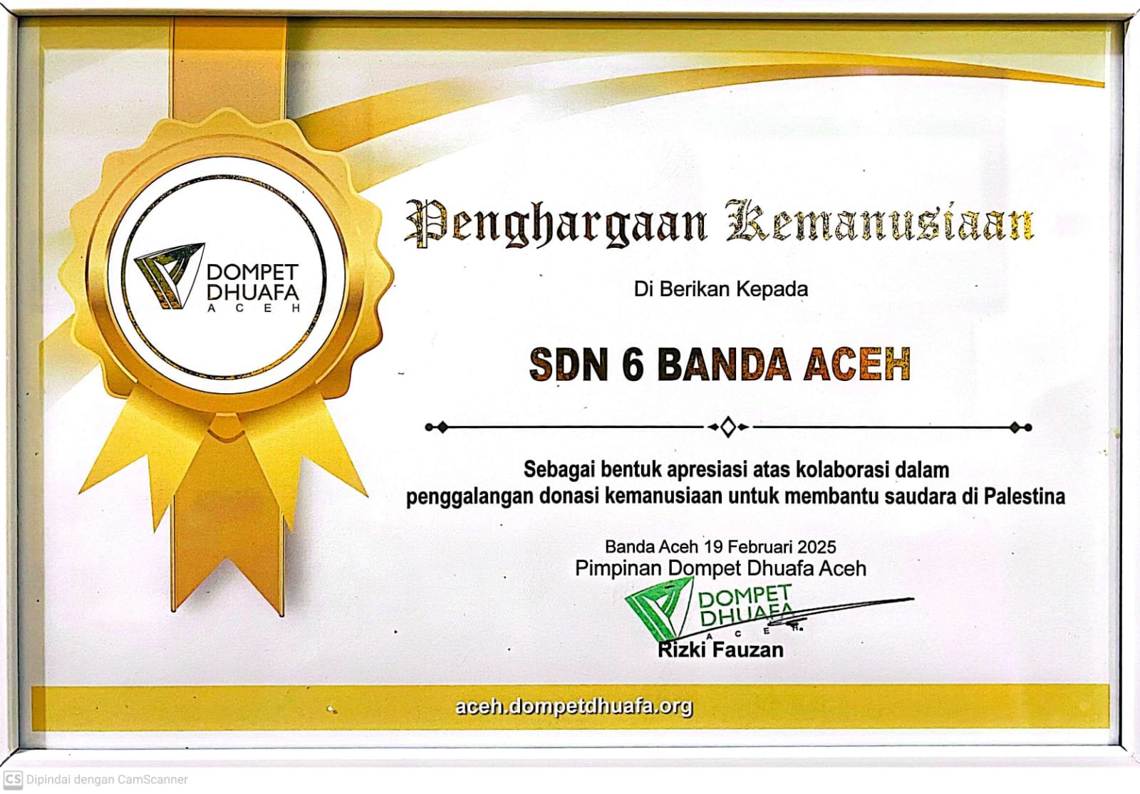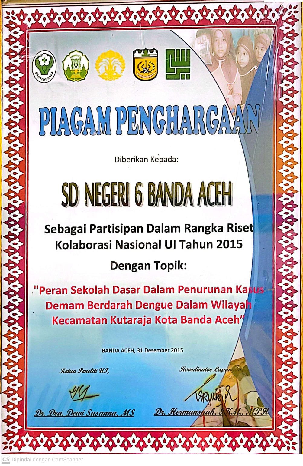 ![]() | Piagam Penghargaan Peran sekolah dasar dalam penurunan kasus demam berdarah dengue dalam wilayah kecamatan kutaraja kota banda aceh |
