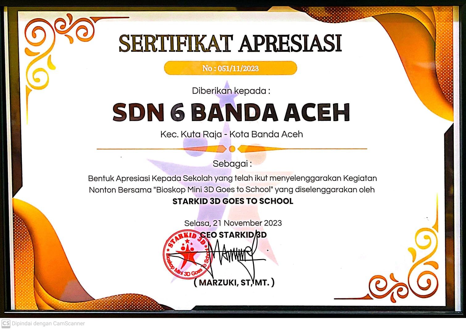 ![]() | Sertifikat Apresiasi Bentuk apresiasi kepada sekolah yang telah ikut menyelenggarakan kegiatan nonton bersama "Biokop Mini 3D goes to school" yang diselenggarakan oleh STARKID 3D Goes to school |