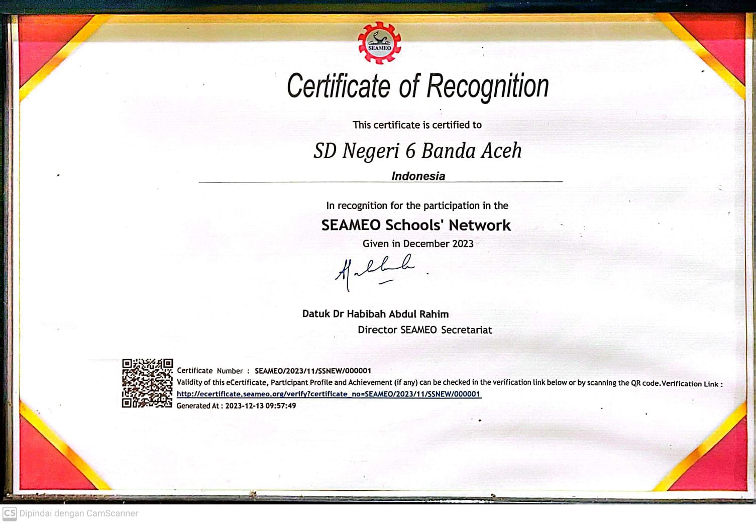 ![]() | Certificate of Recognition In recognition for the participation in the SEAMEO schools Network |